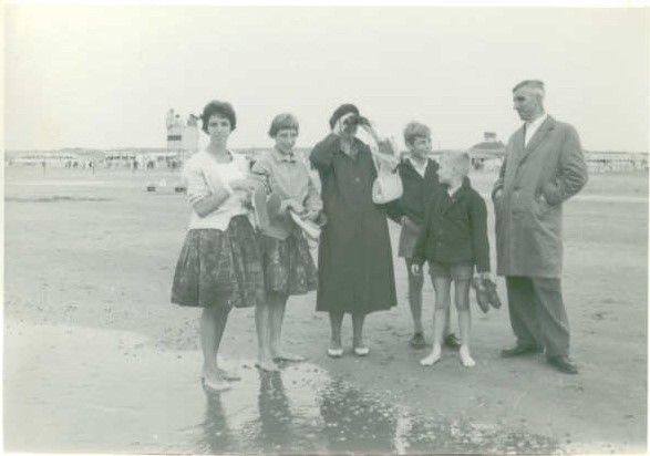 Meijendel in Wassenaar In Wassenaar in Meijendel is de volgende foto gemaakt. Het is dan Maart 1958. Het is in die tijd de gewoonte om met een hoedje op weg te gaan. Als het gezin naar het strand gaat, maken ze in de ochtend stapels boterhammen en nemen heel wat drinken mee. Op het strand zit Wim senior altijd te slapen, hij is vaak moe. Hij doet het voor het gezin. Op het strand worden geen consumpties gekocht, daar is geen geld voor en dat is ook niet de gewoonte. Soms krijgen de kinderen aan het eind van de dag een ijsje. Vaak waait het hard en zetten ze een windscherm op, wat altijd een heel gedoe is. Maar ze hadden steeds veel plezier.